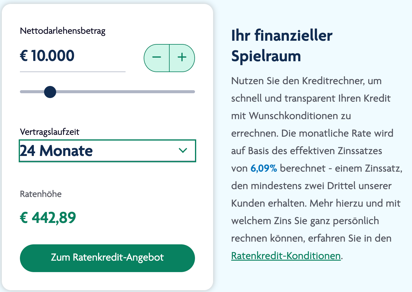 Wählen Sie einfach Ihren gewünschten Kreditbetrag und die passende Laufzeit aus, um sofort eine Orientierung über Ihre potenzielle monatliche Rate zu erhalten. Die Berechnung erfolgt transparent anhand des repräsentativen 2/3-Zinssatzes, sodass Sie Ihre Finanzplanung realistisch gestalten können.