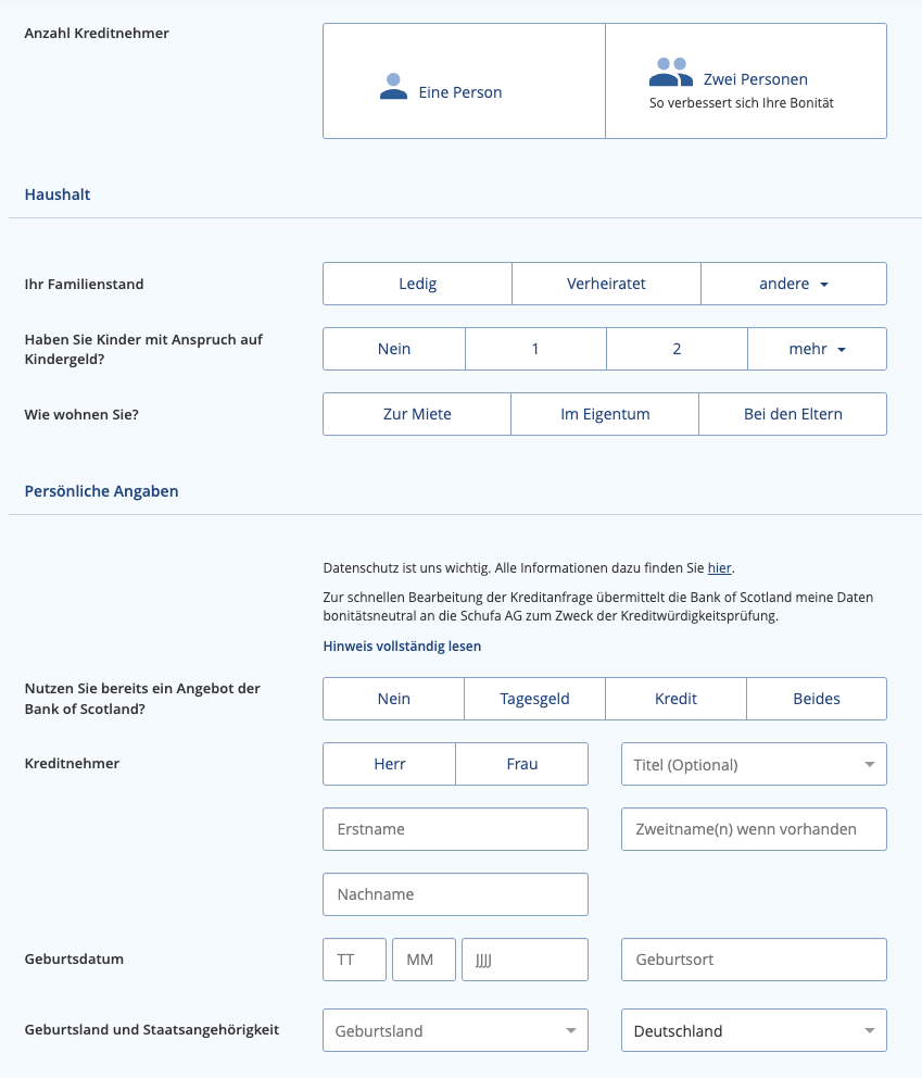 Wenn man bedenkt, dass der durchschnittliche Zinssatz für Konsumentenkredite in Deutschland 2024 bei über 8% lag, wird deutlich, wie viel günstiger die Konditionen bei der Bank of Scotland ausfallen können.