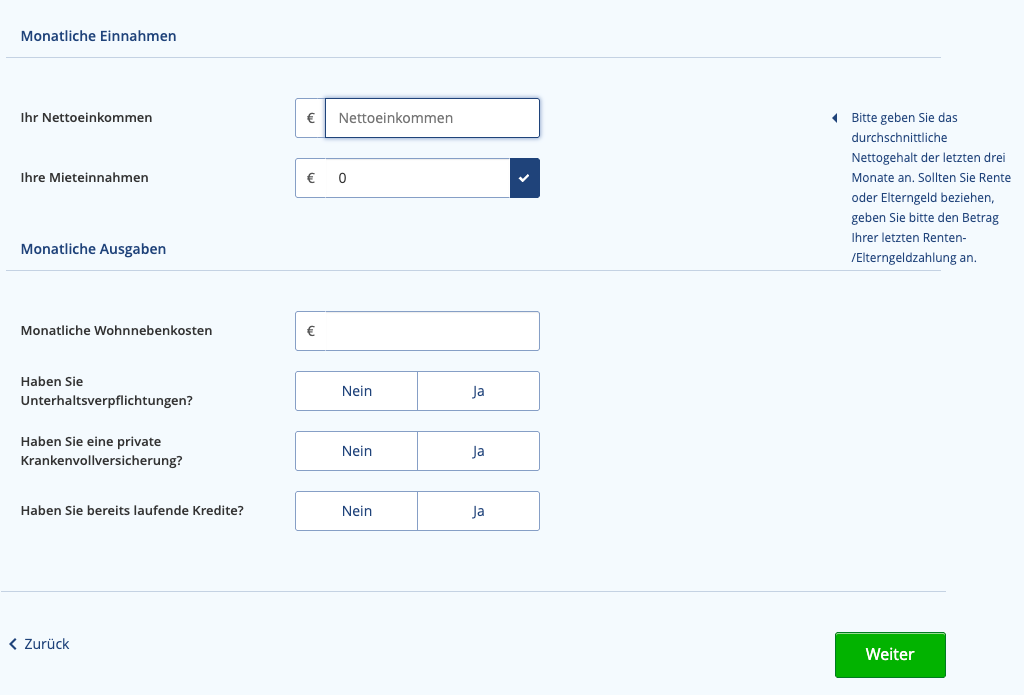 Hier werden grundlegende Informationen zu Ihren regelmäßigen Einnahmen und monatlichen finanziellen Verpflichtungen abgefragt, die für eine fundierte Bonitätsprüfung und passende Kreditkonditionen entscheidend sind.