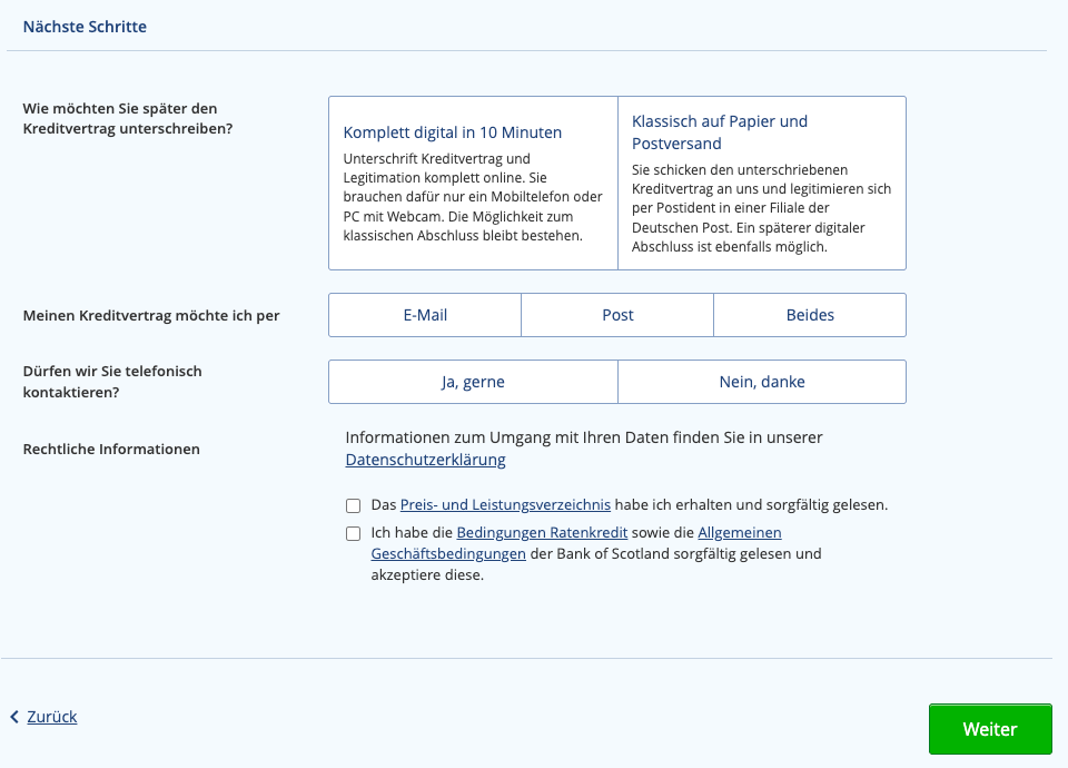 Ja, die Bank of Scotland akzeptiert Unterlagen auch per Post. Allerdings ist zu beachten, dass diese Option den Kreditprozess erheblich verlangsamt. Während ein vollständig online abgewickelter Kredit in der Regel innerhalb von 1 bis 2 Werktagen ausgezahlt wird, kann der postalische Weg die Bearbeitungszeit auf über eine Woche ausdehnen.