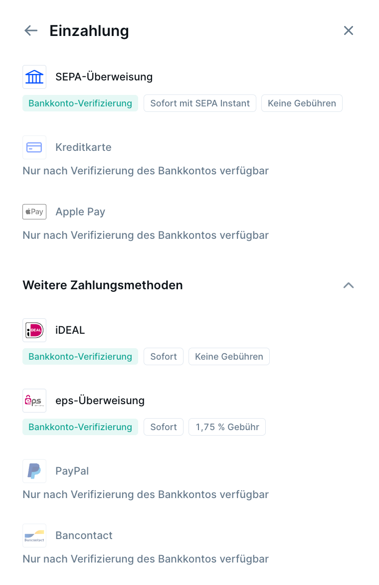 Andere EinzahlungsmethodeniDeal, eps-Überweisung, Bancontact, Apple Pay