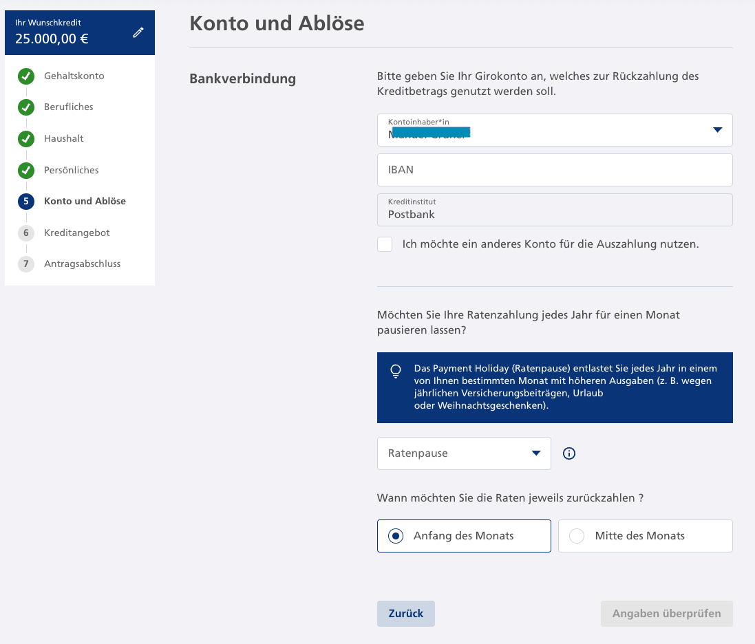 Zum Abschluss geben Sie Ihre Bankverbindung (IBAN) an, woraufhin die Postbank Ihren Antrag prüft und Sie zeitnah über die Kreditentscheidung informiert.