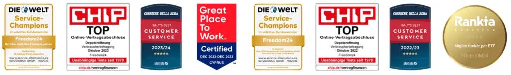 Die Seriosität des Online-Brokers wird nicht nur durch die erteilte Lizenz, sondern auch durch zahlreiche weltweite Auszeichnungen bestätigt. Im Test des renommierten Verbraucherportals chip.de belegte Freedom24 den zweiten Platz unter 29 Anbietern und wurde nur knapp von comdirect übertroffen.