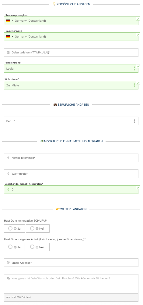 Danach füllen Sie ein kurzes Formular mit Angaben zu Ihrem Nettoeinkommen, Wohnstatus, Familienstand sowie monatlichen Ausgaben und bestehenden Krediten aus. Bei Bedarf können Sie in einem Feld (max. 200 Zeichen) Ihre individuelle Situation genauer erläutern.