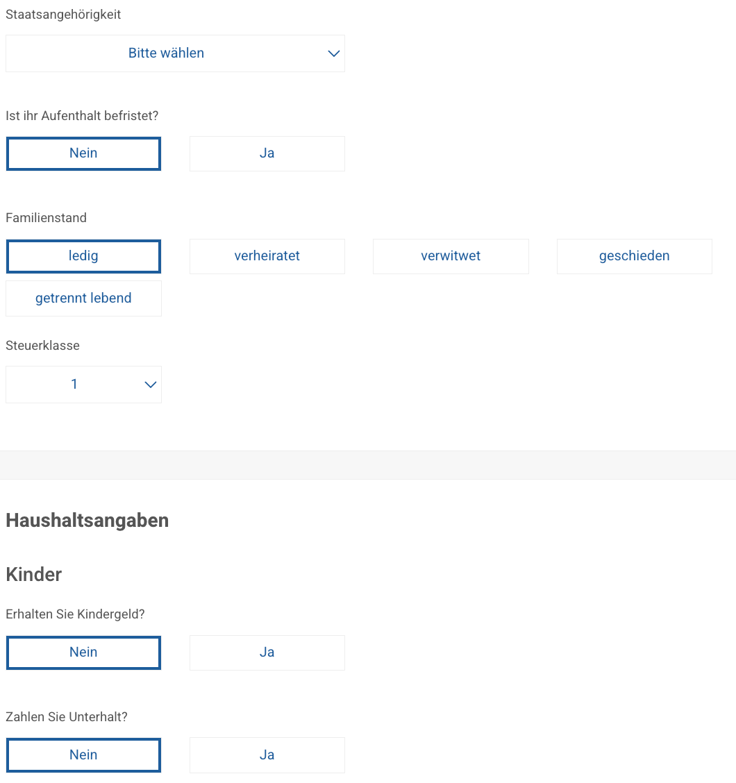 Die Sektion “Lebenssituation” ist sehr schnell ausgefüllt und erfasst Informationen zu Ihrer Staatsangehörigkeit, Aufenthaltsstatus und Familienstand.