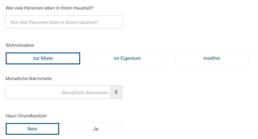 Der letzte Schritt umfasst die Wohnsituation sowie weitere Angaben. Wie der Name bereits erahnen lässt, fragt Maxda nach der Anzahl der Personen, die mit Ihnen in einem Haushalt leben, der Wohnsituation (zur Miete, im Eigentum oder mietfrei) sowie der Höhe der Miete, die womöglich anfällt.