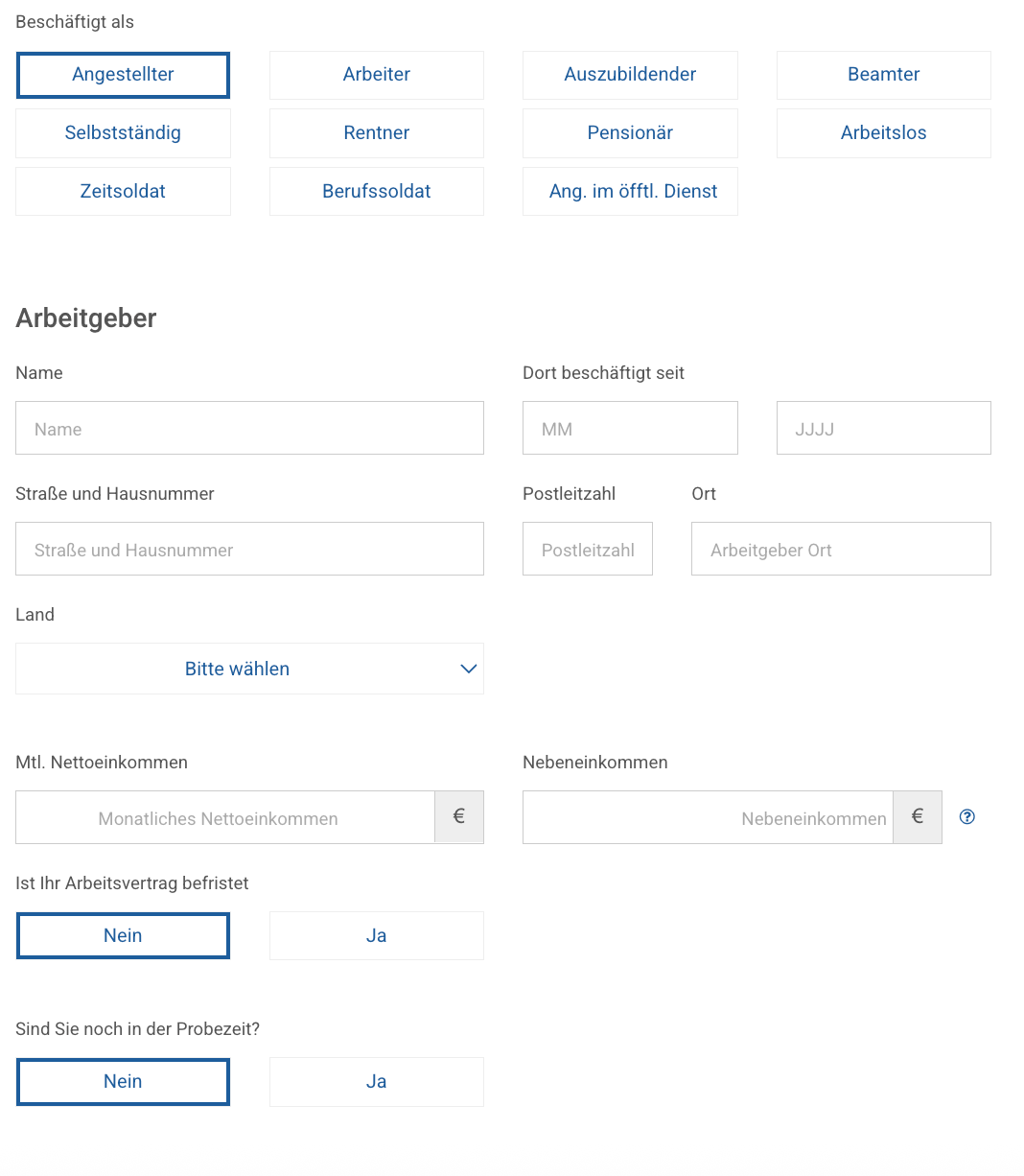 Auch das monatliche Einkommen muss angegeben werden sowie Informationen dazu, ob Sie sich noch in der Probezeit befinden und ob Ihr Arbeitsvertrag befristet ist.