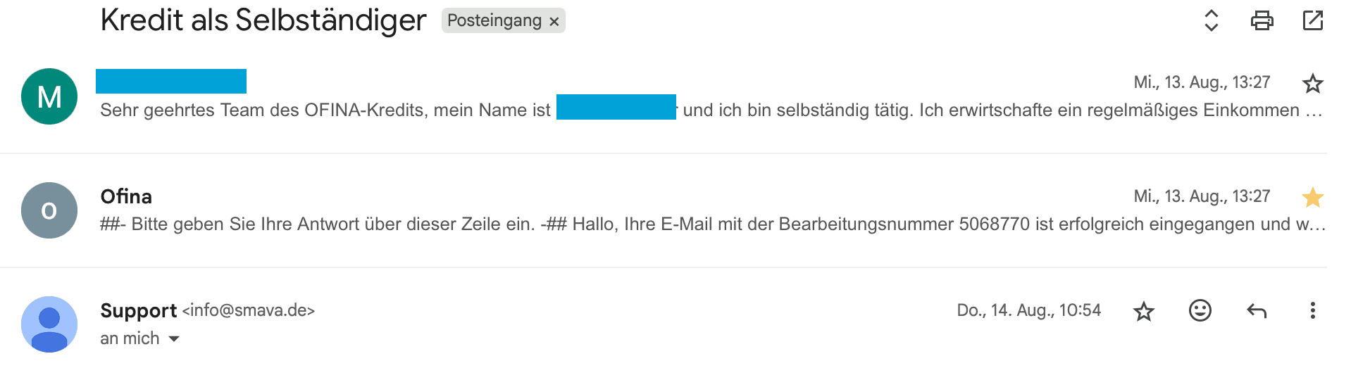 Ich benötigte schnellstmöglich einen Kredit und bei Ofina hat das perfekt geklappt. Schnelle Auszahlung und freundlicher Kundenservice, tolle Arbeit! Alles einwandfrei abgelaufen.