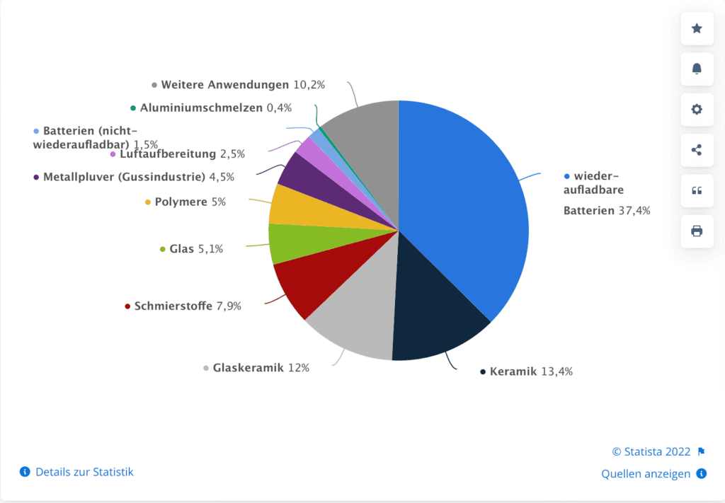 Mehr als 37,4% der weltweiten Lithiumproduktion fließt bereits in die Herstellung wiederaufladbarer Batterien, besonders Lithium-Ionen-Akkus.