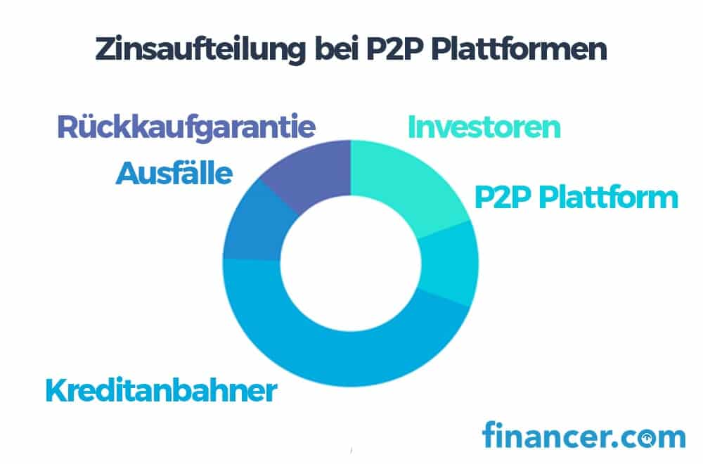 Genaue Zahlen dazu gibt es nicht. Fakt ist jedoch, dass die Rückkaufgarantie vom Zinsspread finanziert wird. In dieser Grafik finden Sie eine repräsentative Darstellung der Zinsaufteilung bei P2P-Plattformen. Die Zahlen zu den Kreditanbahnern, die Kredite auf den P2P-Martkplätzen listen, bleiben noch immer sehr intransparent. Der Zinsanteil für die Rückkaufgarantie und die tatsächlichen Ausfälle werden dem Kreditanbahner zugeteilt. Dazu kommen auch noch die Verwaltungskosten sowie Marketingausgaben und Gewinnmargen.