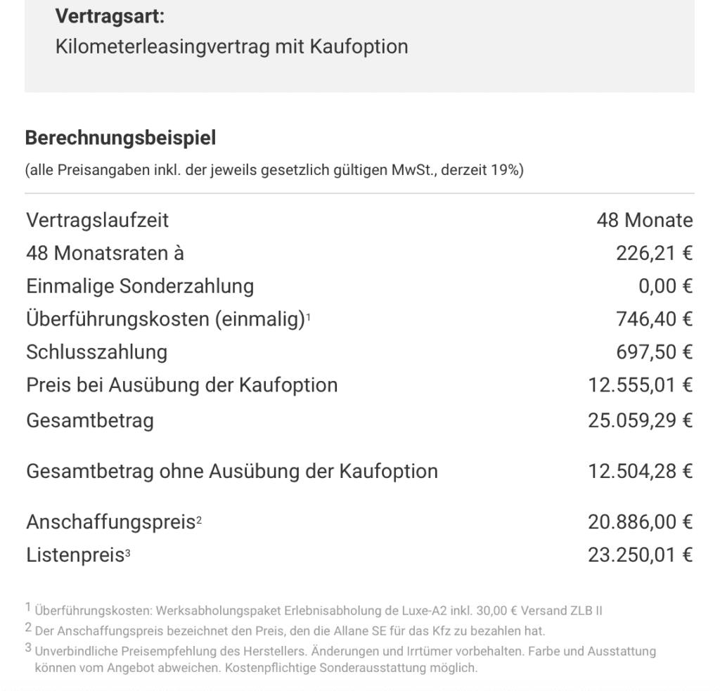 Bei gleicher Laufzeit, Anzahlung sowie jährlicher Laufleistung könnten die finanziellen Rahmenbedingungen wie folgt gestaltet sein: