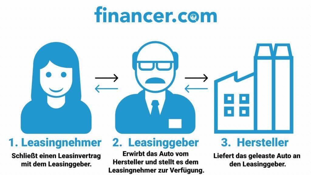 Ein Leasingvertrag ist im Wesentlichen ein Geschäft, an dem drei Parteien beteiligt sind. Die folgende Grafik erklärt dies genauer: