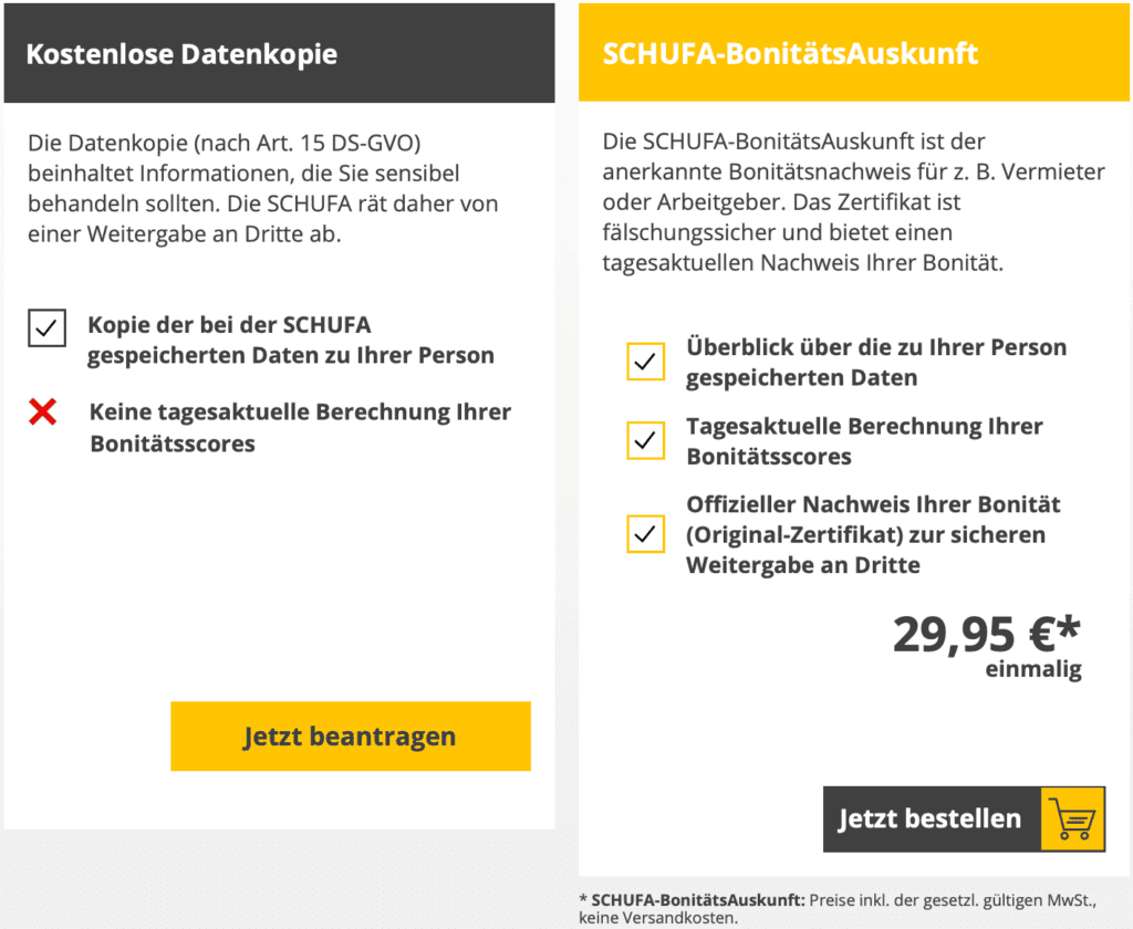 Da die Schufa-Selbstauskunft bzw. Datenkopie nur einmal im Jahr kostenlos beantragt werden kann, müssen Sie bei jeder weiteren Auskunft auf die kostenpflichtige Schufa-BonitätsAuskunft zugreifen.